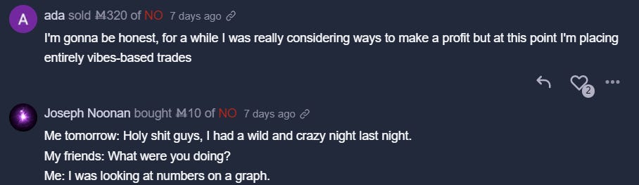 Manifold Markets has many claims to legitimate forecasting with an end goal of providing value… this isn’t one of them. Gamblers Traders set their differences aside to form teams which vied to push The Market above or below a 50% average.