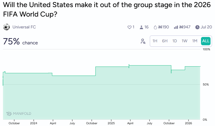 The US benefits from home advantage and drew a favourable group. Markets give them a stronger 75% chance to advance from the group stage but essentially zero chance of winning the tournament.
