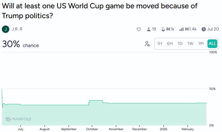 UK MPs called for the US team itself to be excluded, citing similar reasoning to Russia’s ban: undermining the rules-based international order. FIFA’s contract allows them to “cancel, reschedule or relocate one or more matches (or the entire FIFA World Cup 26) for any reason” including “health, safety or security concerns.” Markets give 30% odds that at least one US WC game is moved because of Trump-adjacent politics, fair odds considering the fact that a clear contractual pathway exists.