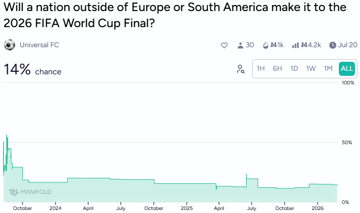 Markets price a non-European or South American finalist at 14%.