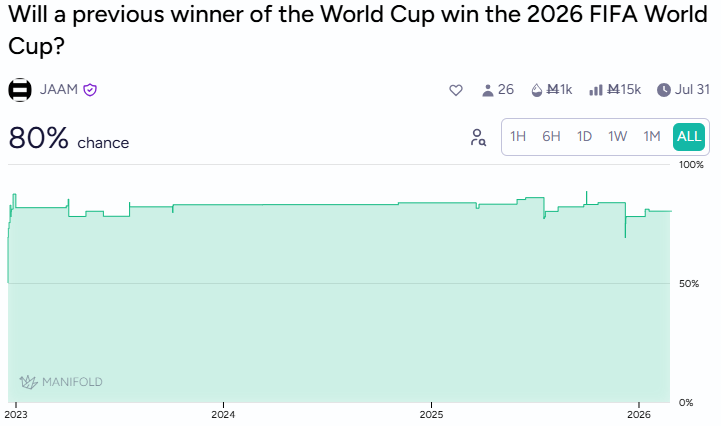 The football itself should be good. Spain leads betting at roughly 17%, England at 13%, France at 12%. The expansion from 32 to 48 teams means more matches and arguably more uncertainty, though markets give an 80% chance a previous winner takes it. Either history matters or traders seemingly lack imagination :(