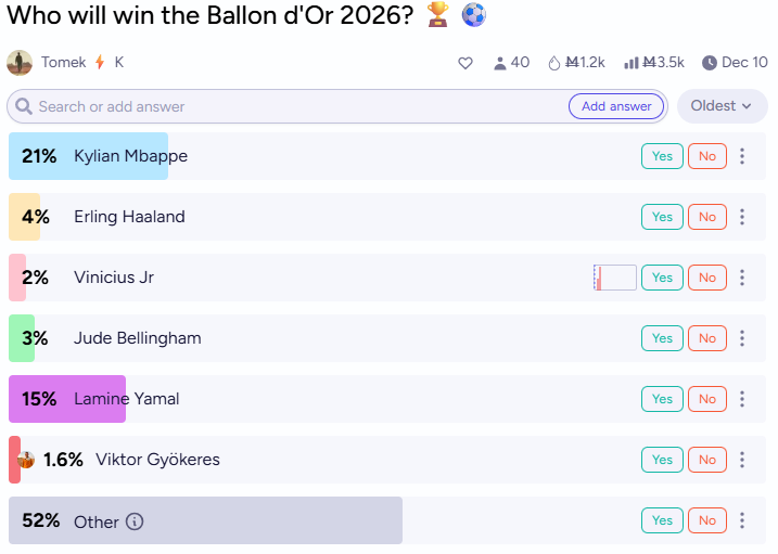 Haaland sits at 4%, down from a high of 20%, and Mbappé at 21%. The Messi-Ronaldo era set expectations so absurdly high that everyone’s still adjusting to what normal excellence looks like. Those two scored 50+ goals per season like it was routine. They won 13 Ballon d’Ors between them across 15 years. The award was basically a binary choice between two players having seasons that would have been all-time great for anyone else.
