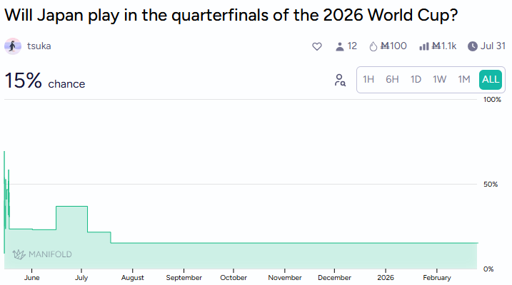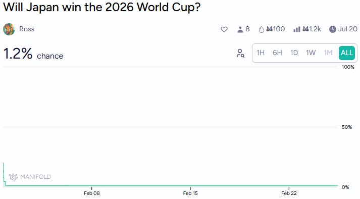 Japan qualified first among non-host nations and sits at 1.2% despite beating both Germany and Spain in 2022 (while their odds of playing in the quarterfinals are more respectable, at 15%).