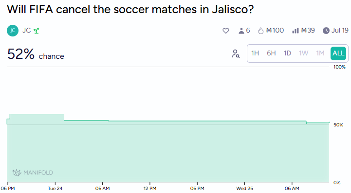 That qualifier might sound dramatic, but markets give 52% odds that FIFA cancels matches in Jalisco due to cartel violence, and 18% that at least one US ally boycotts the American portion of the tournament.