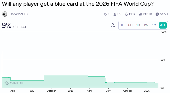 FIFA is also introducing blue and purple cards. Blue for tactical fouls, purple for dissent. Players get 10 minutes off for either. Markets are sceptical about consistent enforcement, which seems reasonable given FIFA’s track record on following its own rules.