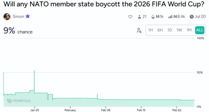 Markets give 9% odds that a NATO member boycotts the World Cup.