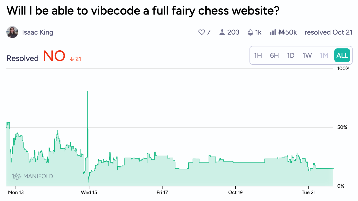 I’m personally a huge fan of these types of complex, personal benchmarks, and I think they illustrate the strength of Manifold’s ability to crowdsource forecasts on AI capabilities. As PhD-level multiple-choice exams and coding competitions become Goodharted, it’s tough to fool a combination project-oriented outcome & market expectation. Right now, Claude Code scores a time-averaged 23% or so on the “vibecoding a chess variant to Isaac’s satisfaction” benchmark. I hope he tries again next year!
