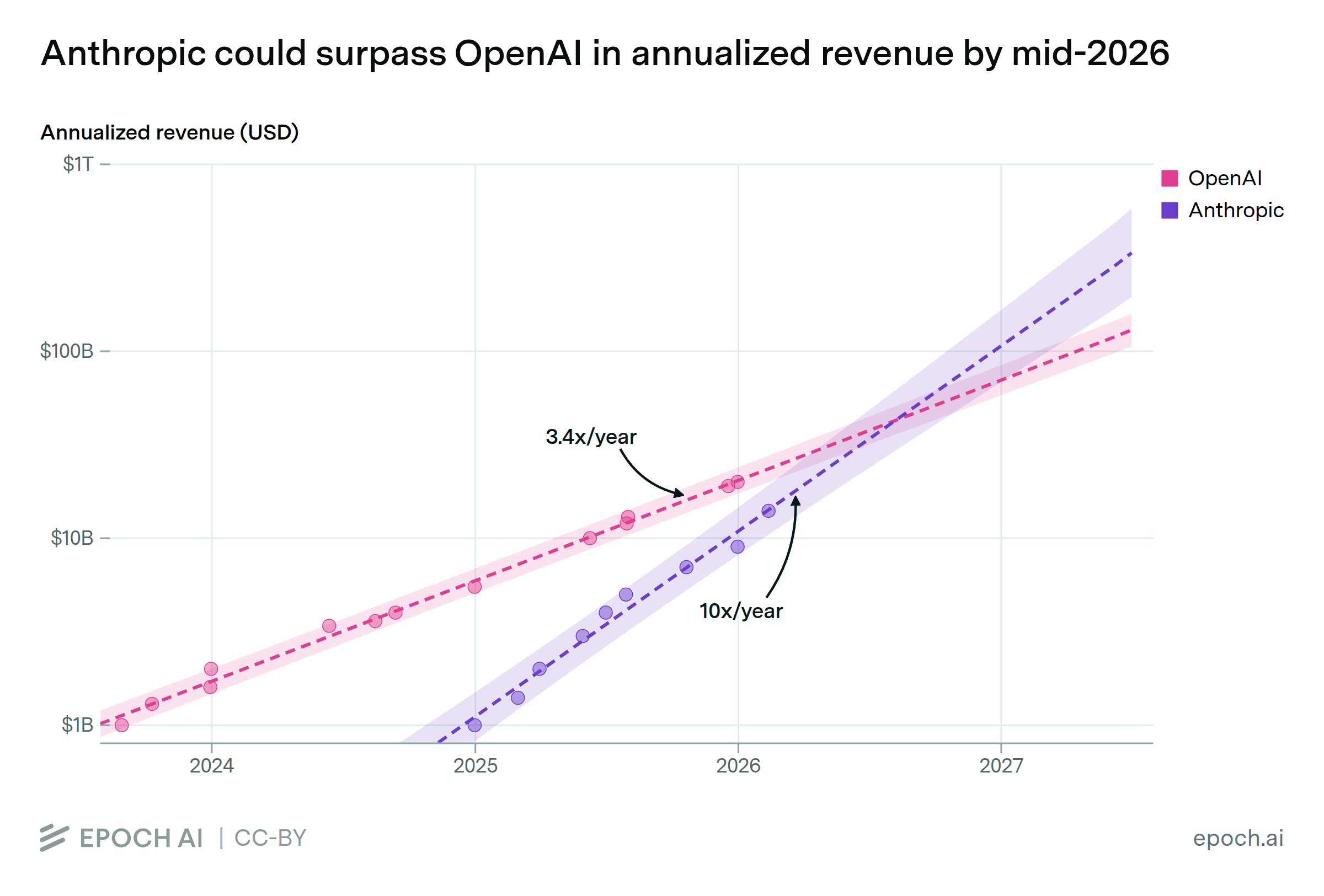 Epoch has had great success drawing straight lines on log-plots, and they called Anthropic surpassing OpenAI’s revenue in early 2026.