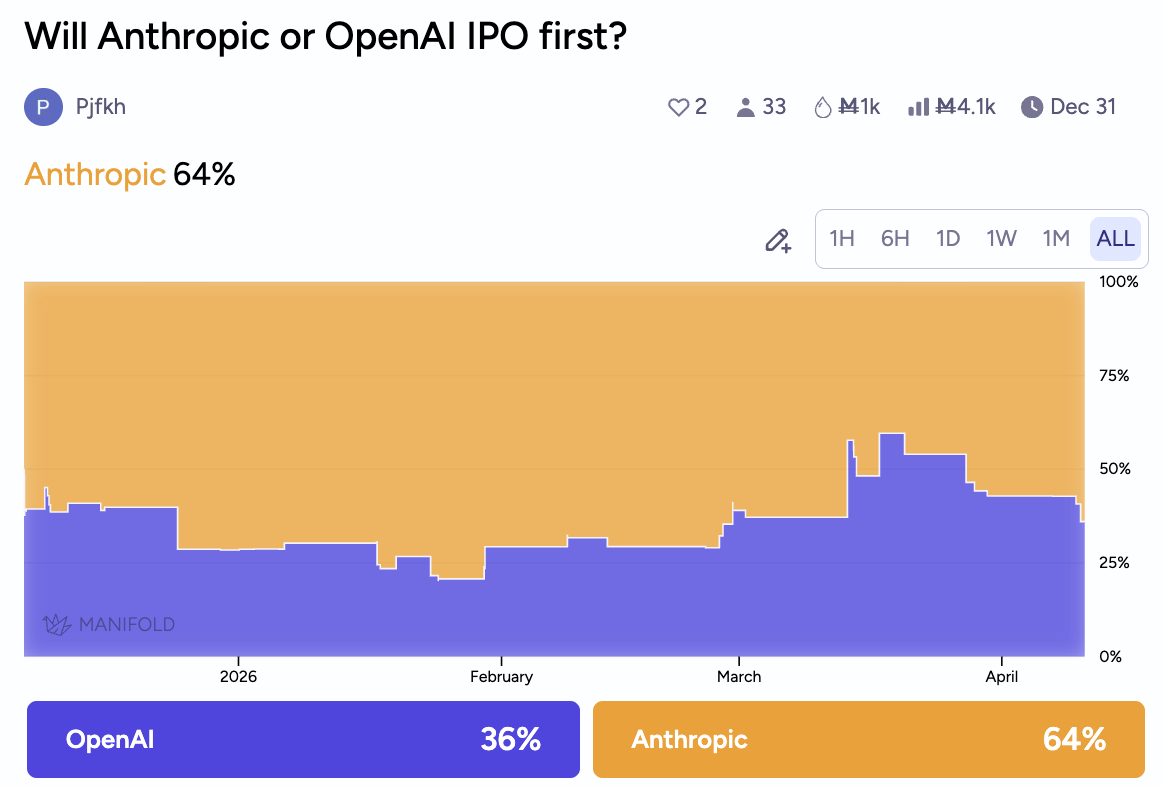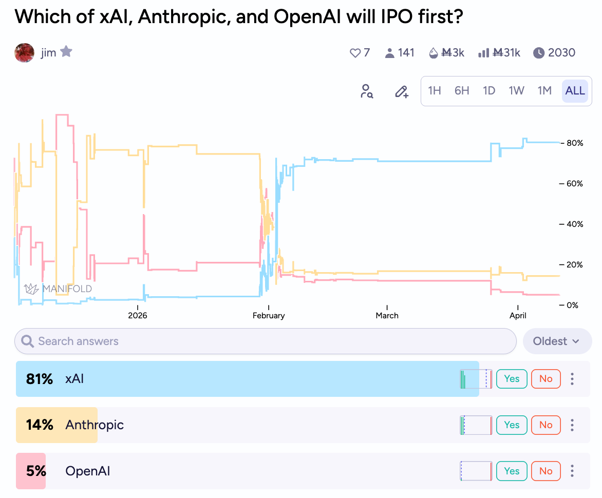 For a while, the race to IPO for American private AI firms looked like more of a three-horse race, but the merger of xAI and SpaceX put that to rest, with SpaceX/xAI now very likely to go public within the next few months.