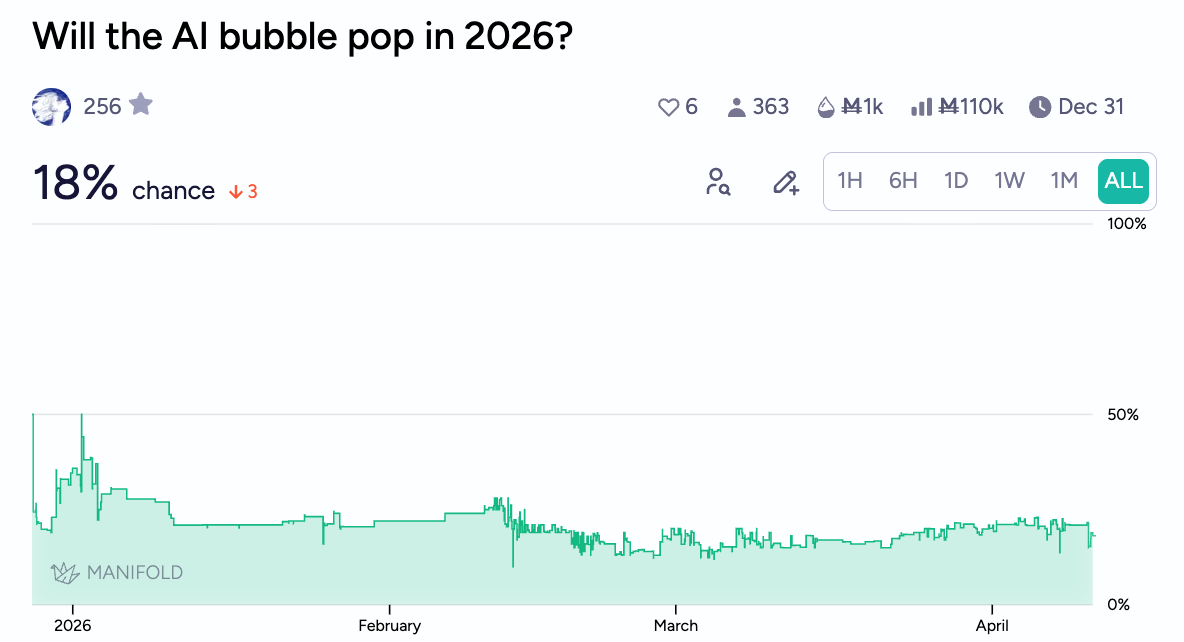 Alternatively, many online and even some on Manifold hold a very different set of beliefs about how AI will play out over this year. While it’s hard to operationalize a market on what an AI bubble “popping” would look like, one creator has given it a good try: