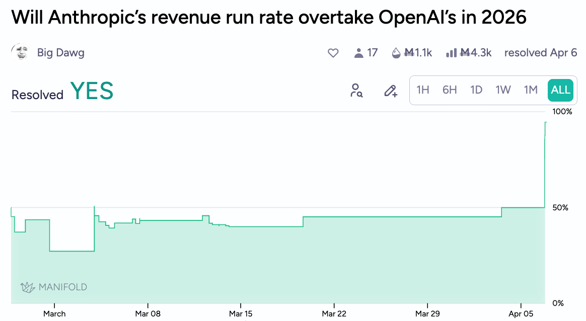 With their latest run-rate revenue forecast of $30 billion a few days ago, this market resolved YES, sending markets on whether Anthropic would flip OpenAI skyrocketing.