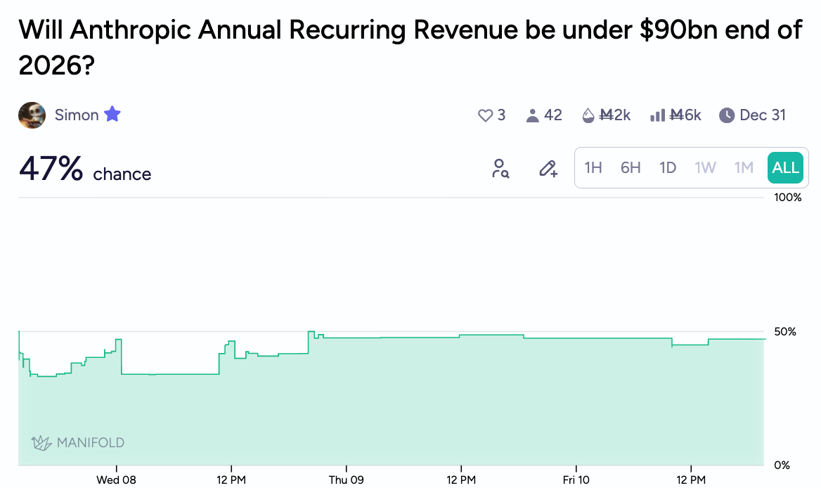 The market on combined EOY revenue for America’s three private AI companies had to create some new buckets in the last week, as the top bound was around $150 billion, which now looks to be below the median trader’s expectations. Two Twitter users (at least one of whom is a top Manifold trader, I believe) made an over/under bet at $90 billion on just Anthropic’s run-rate revenue, and we now have a market on it: