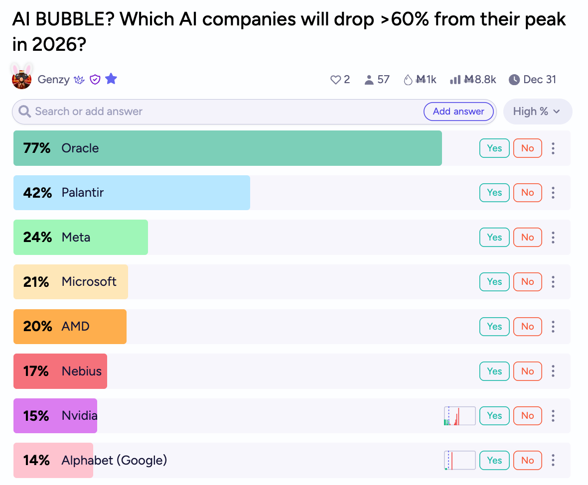 Alternatively, another creator has simply made a market on which AI companies will drop dramatically from their peak this year. Apart from Oracle, traders think this is unlikely for most firms that are heavily leveraged in the AI boom.