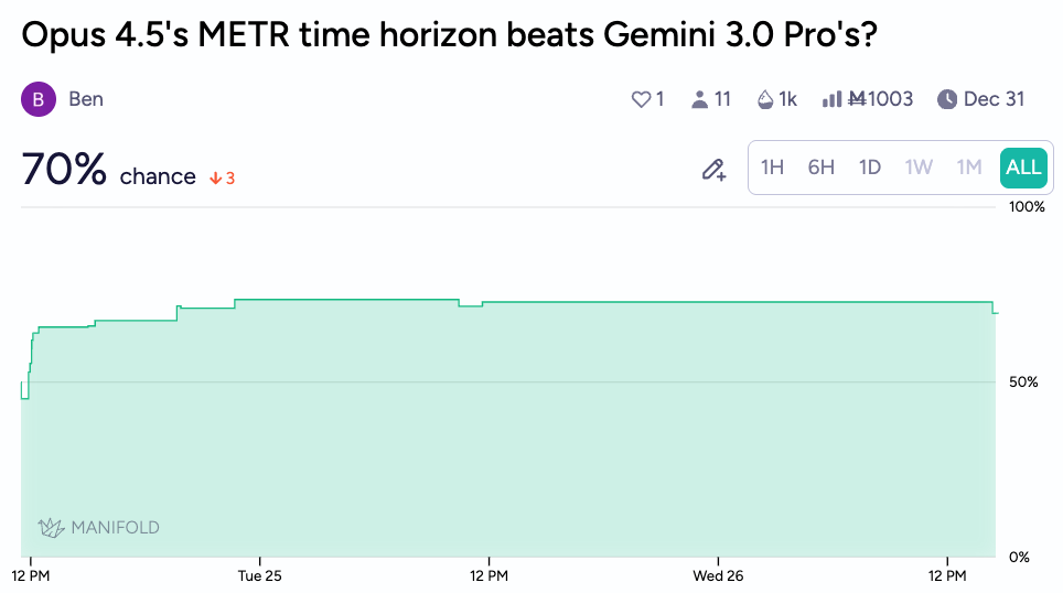 As we wait for Gemini 3’s METR score, we now are also waiting for Claude Opus 4.5’s. And just as Gemini’s was forecast to beat GPT 5’s, now Claude is forecast to outpace Gemini, with some forecasters informing their betting activity by attempting to reverse engineer sections of the METR time horizon benchmark related to software engineering tasks to compare the two models.