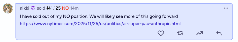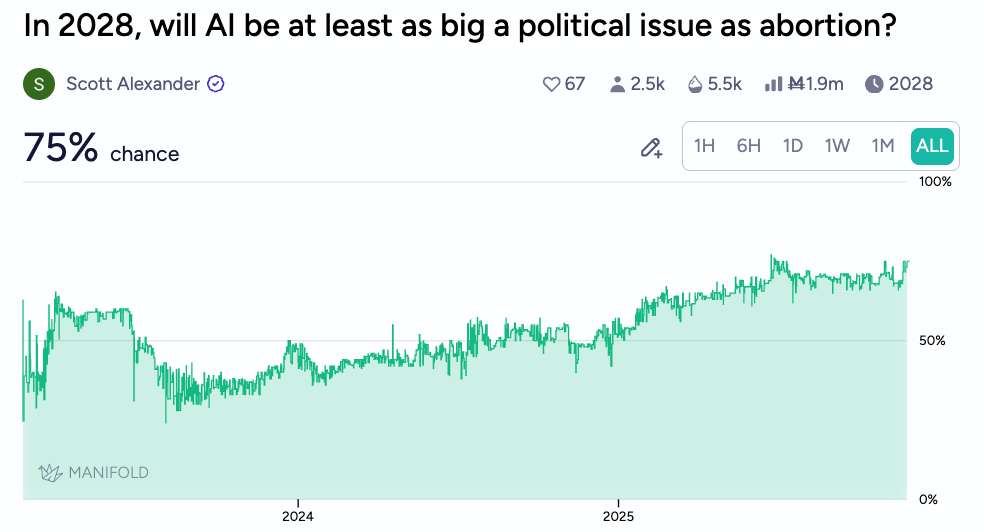 The market on whether AI will be as big of a political issue as abortion by 2028 has been ticking up slowly over the year, and might have been affected by the news from yesterday.
