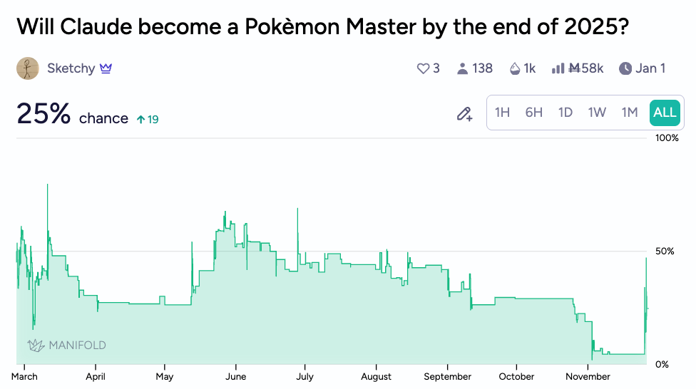 Claude has also renewed its quest to become a Pokémon Master, with a 25% chance of being the first to claim that benchmark! Well… not entirely the first. Gemini 2.5 Pro performed the feat earlier in the year, but was criticized for making use of extensive “agent harnesses” designed specifically for the challenge. Claude’s approach is a little less Machiavellian, perhaps. These kinds of benchmarks in a contained environment, when approached in good faith by the AI labs, can be a good proxy for broad agentic capabilities. You can also once again follow along on Twitch and bet on specific milestones in Claude’s run.