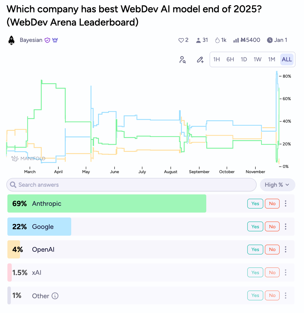 Already laying a claim to the frontier placement that Google pushed forward just last week, Anthropic’s Claude Opus 4.5 is probably now the best model for at least a couple months in coding and computer use applications. Though Arena-style leaderboards are not always the most reliable benchmarks, they’re the ones most tracked on prediction market platforms, and traders think Anthropic will retain their hold on the computer agent leaderboard (as they had already been forecast to do since October when it became clear that Opus 4.5 would likely drop by the end of the year), as well as the website development leaderboard.