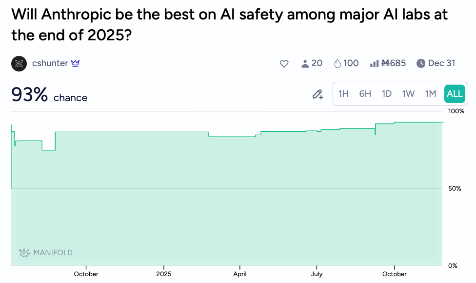 Anthropic appears likely to keep their hold on the leaderboard at “AI Lab Watch” as well. Perhaps some recognition for disrupting Chinese AI espionage attempts and releasing 100+ pages of safety evaluations for their latest model.