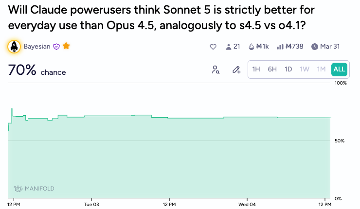As for the more subjective metric of whether Claude power users will prefer Sonnet 5 to Opus 4.5, Manifold traders give this pretty good odds, at around 70%.