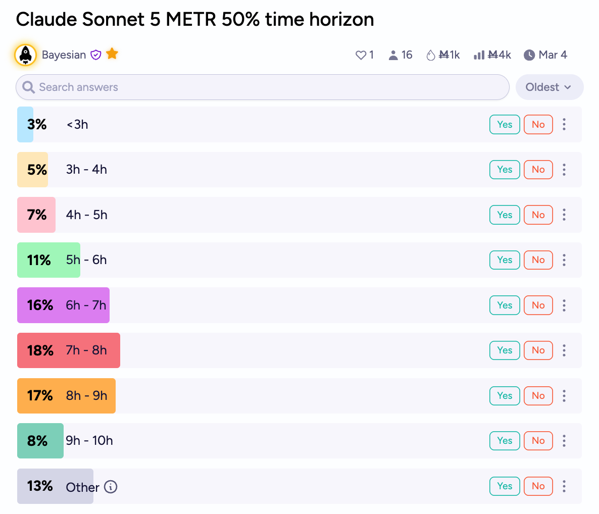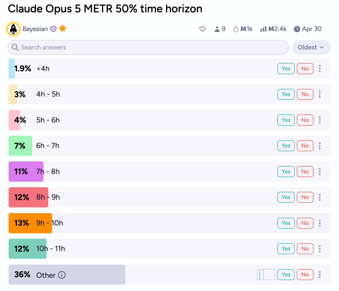 Traders expect that when Opus 5 comes out later this year, there’s a good chance it will require METR to expand their task portfolio to include more tasks above 10 hours, which are currently lacking.