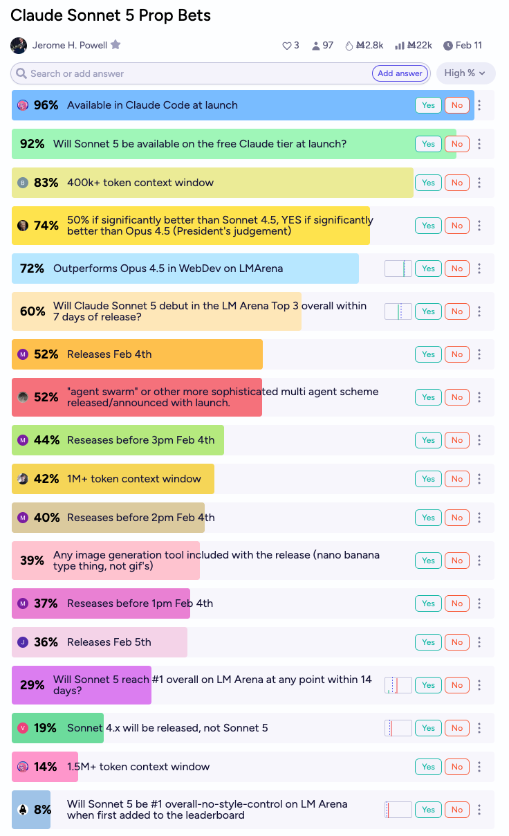 You can also, of course, bet on some of the capabilities of the imminent Sonnet 5 in a props market. Traders think it might come with “Agent Swarm” capabilities, which Twitter rumors describe as releasing multiple teams of synchronized agents simultaneously, in a “swarm,” upon your request. Traders also think it likely that the context window for Sonnet 5 will improve, and that it will outperform it’s larger and three month-older sibling, Opus 4.5 on WebDev arena and in the eyes of Manifold poll respondents.
