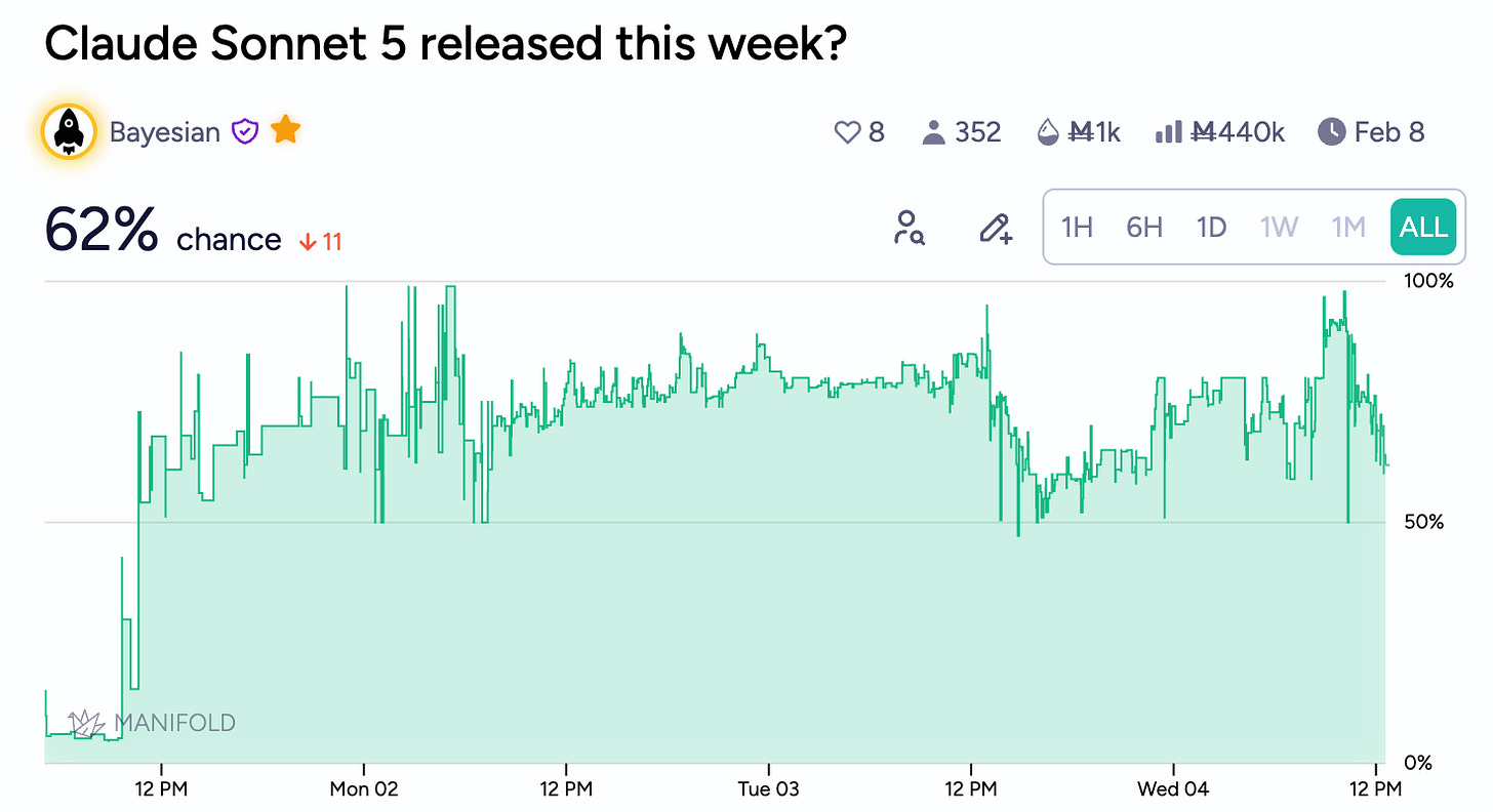 Traders were pretty confident through most of Monday and Tuesday that Sonnet 5 was due to be released around 10am PT on Tuesday. When it wasn’t, the market on Sonnet’s release this week took a nosedive, but recovered on robust reports that perhaps today (Wednesday) would be the day the model is released instead. Now, as the hours creep on with no hint of a new release from Anthropic, the market is slowly ticking down, and likely to crater if morning on the West Coast passes with no release.