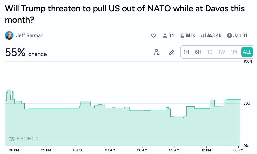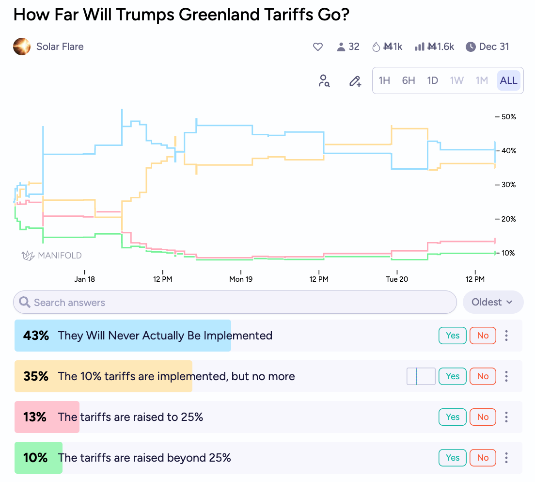 Still, conflict over Greenland seems unlikely. A 1-hour special operation would not be sufficient to establish American control over the island, and would risk alienating… well… nearly every American ally? In the meantime, an economic war may have already begun. Trump has promised tariffs beginning at the end of the month to several European nations who have posed obstacles in his acquisition of Greenland, and the market thinks there’s a decent chance these tariffs (which would be reciprocated by Europe) will go into effect, with some odds of a substantial escalation in the future.