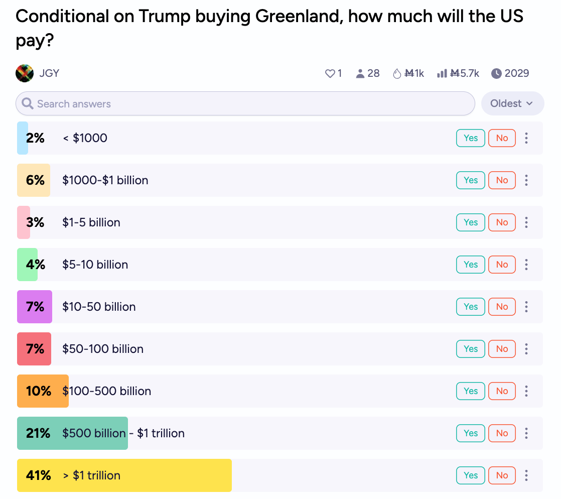 A renewed negotiating effort with Europe, coupled with perhaps an explicit financial offer for the island, have helped convince traders. The odds of a purchase in 2026 remain low, but traders think the price tag would run into the high hundreds of billions, if not over $1 trillion, if a purchase is made.