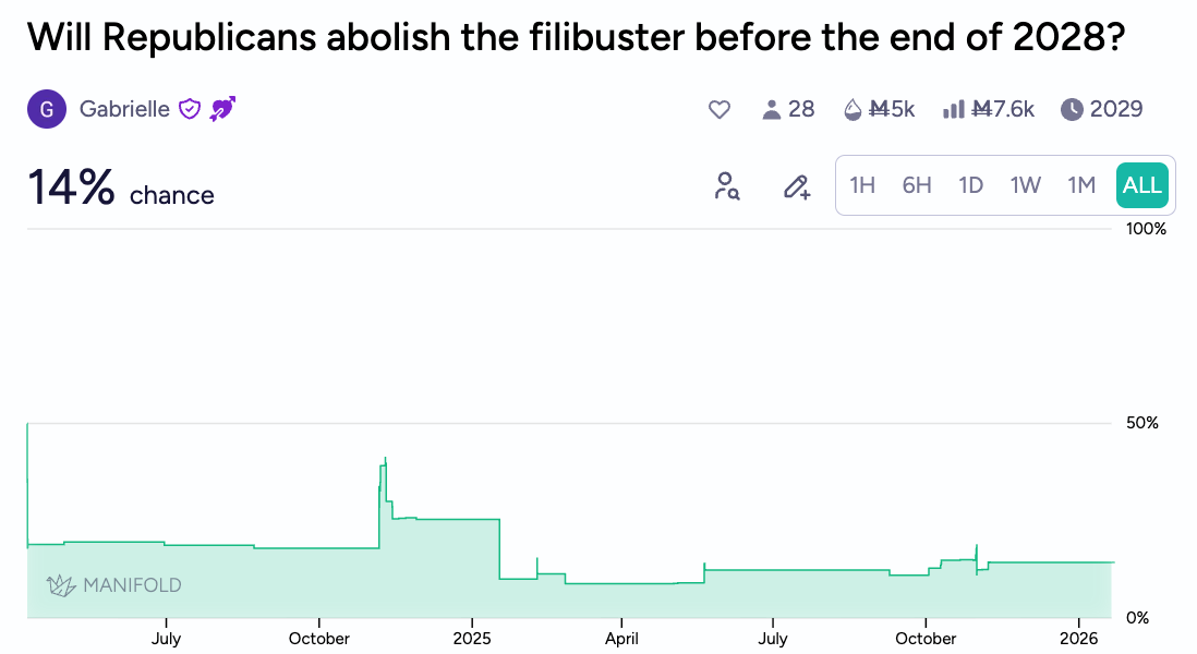 Discourse around the 51st state has been all over the map for the last 12 months. Puerto Rico and DC were the popular candidates for most of the preceding decade, but early last year, amidst tariff discussions, there was discourse from the White House on Canada becoming our “cherished 51st state.” And for the last few months, despite some buzz around Venezuela, Greenland has become the trendy candidate. Randy Fine (R-FL) has even introduced a bill to this effect. Despite this, the market hasn’t moved much, still expecting that if a 51st state is added to the union, it will probably be DC or PR.