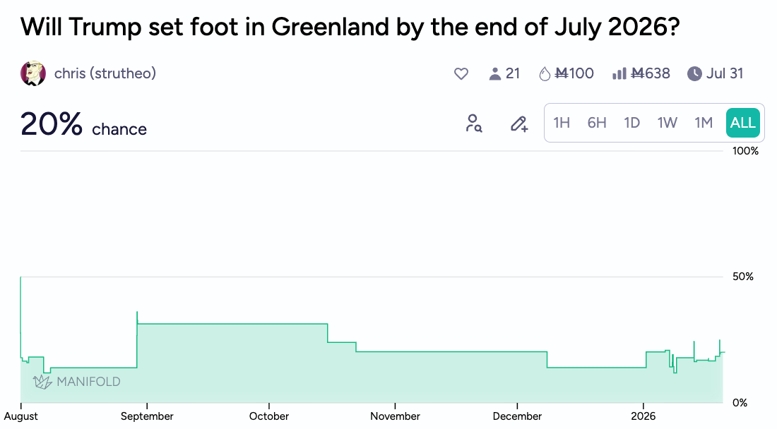 Now, we contend with the prospects of an actual Ice War. Odds remain quite low of an invasion of the island this year, or even limited strikes, with traders giving less than 10% odds. That being said, 9% is not nothing; if you had asked traders their true probability for this event back in 2024, they would have probably bought as many NO shares as interest rate considerations would allow.