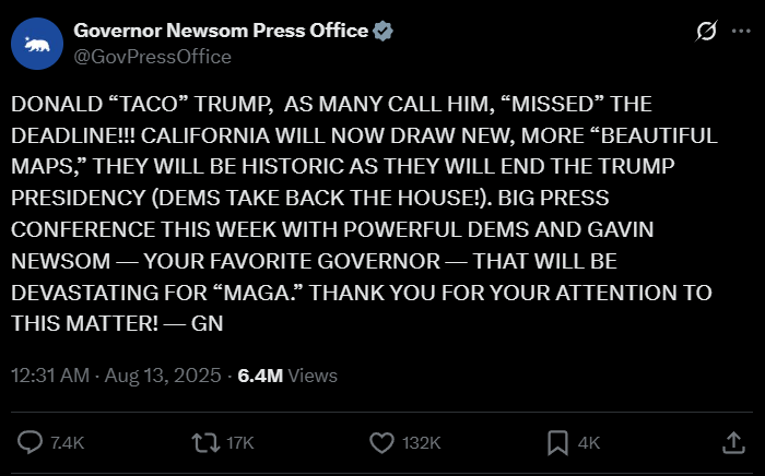 After years of watching Republicans systematically dismantle norms while Democrats held increasingly ineffective seminars on institutional integrity, Newsom’s approach feels refreshingly direct. The man who built his early career on progressive virtue signalling has apparently learned something about the modern political moment. Sometimes you need to meet fire with fire (or perhaps more accurately, fight all-caps Twitter tantrums with all-caps Twitter tantrums).