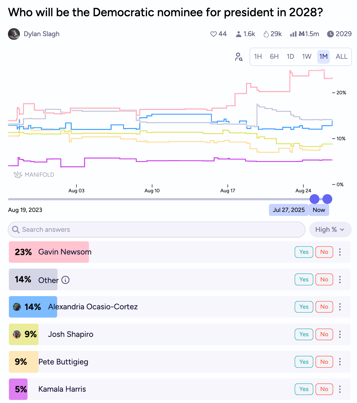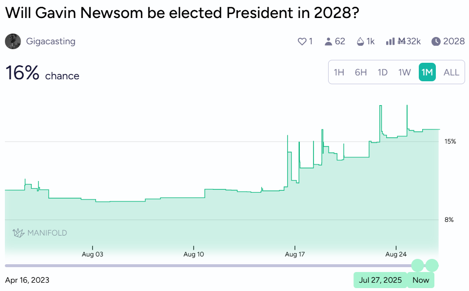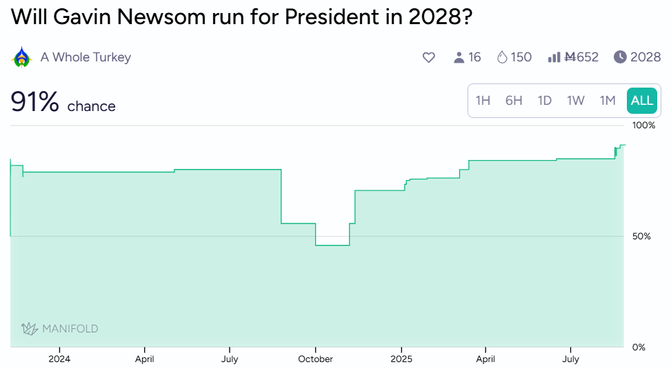 Newsom's 2028 Democratic primary odds have been quietly climbing, with various sources now placing him between 15-30% to win the nomination, up from single digits earlier this year. The redistricting announcement appears to have given him another bump, suggesting that markets view his willingness to fight constitutional hardball as a feature, not a bug.