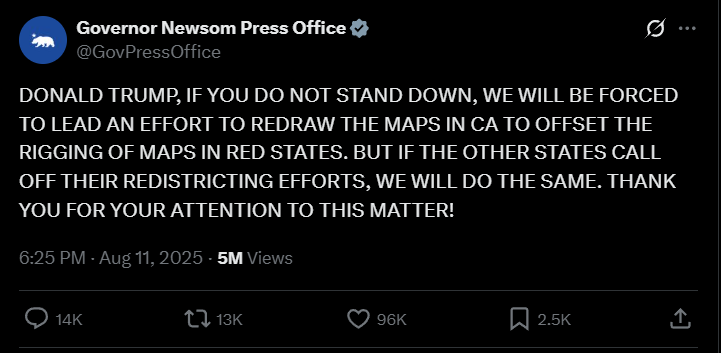 Gavin Newsom announced last week that California would pursue constitutional changes allowing the state to redraw its congressional maps. The move comes in direct response to Republican redistricting shenanigans: specifically, Texas’ brazen attempt to gerrymander their way to a more comfortable House majority. The aptly named "Election Rigging Response Act" (a name that wins points for directness, if not subtlety) represents Newsom's latest salvo in what's shaping up to be a fascinating game of constitutional chicken between blue and red states.