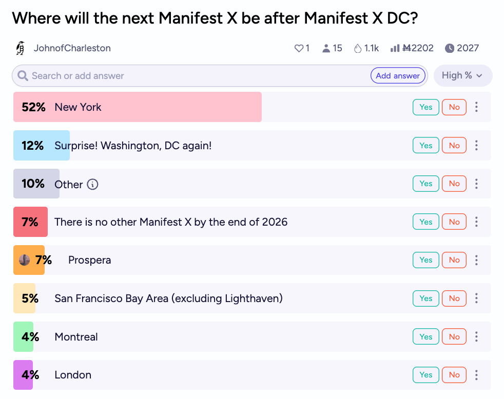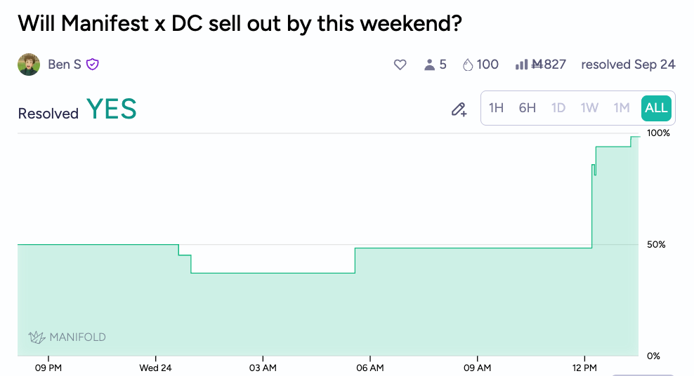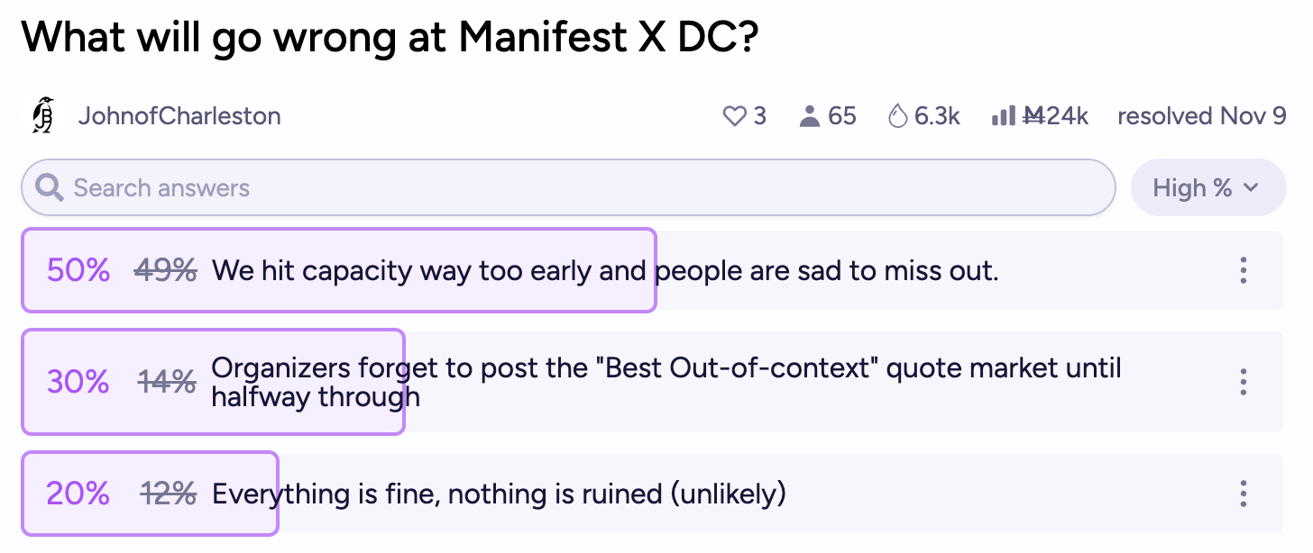 As usual, the best parts of the event were conversations in the cracks between the talks. The advantage of a smaller event, with a higher fraction of local attendees, was that less effort had to go into finding people to meet. It was feasible, if you put your mind to it, to talk to nearly every other attendee for at least a passing moment. And many of these attendees might live in your neighborhood! In the bay, every other person works in tech, and in DC, every other person at least peripherally works for the government. It’s far easier to “build things” in the bay than it is to affect policy outcomes in DC, but the group of wonks and bureaucrats that assembled at Manifest x DC were a pretty agile bunch. A community of forecasters from across the government is a pretty unique network unified by epistemology, rather than ideology.