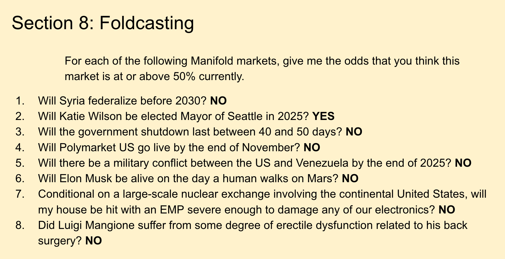 The panel of Manifold founders unveiled some tentative updates for the firm, and a couple of top Manifold traders unveiled some free trading alpha. I ran a live pub trivia-style forecasting competition where teams worked together to give their answers were given as percentages, and the team with the best-calibrated answers won. Here was the final round. Phone use was prohibited, of course: