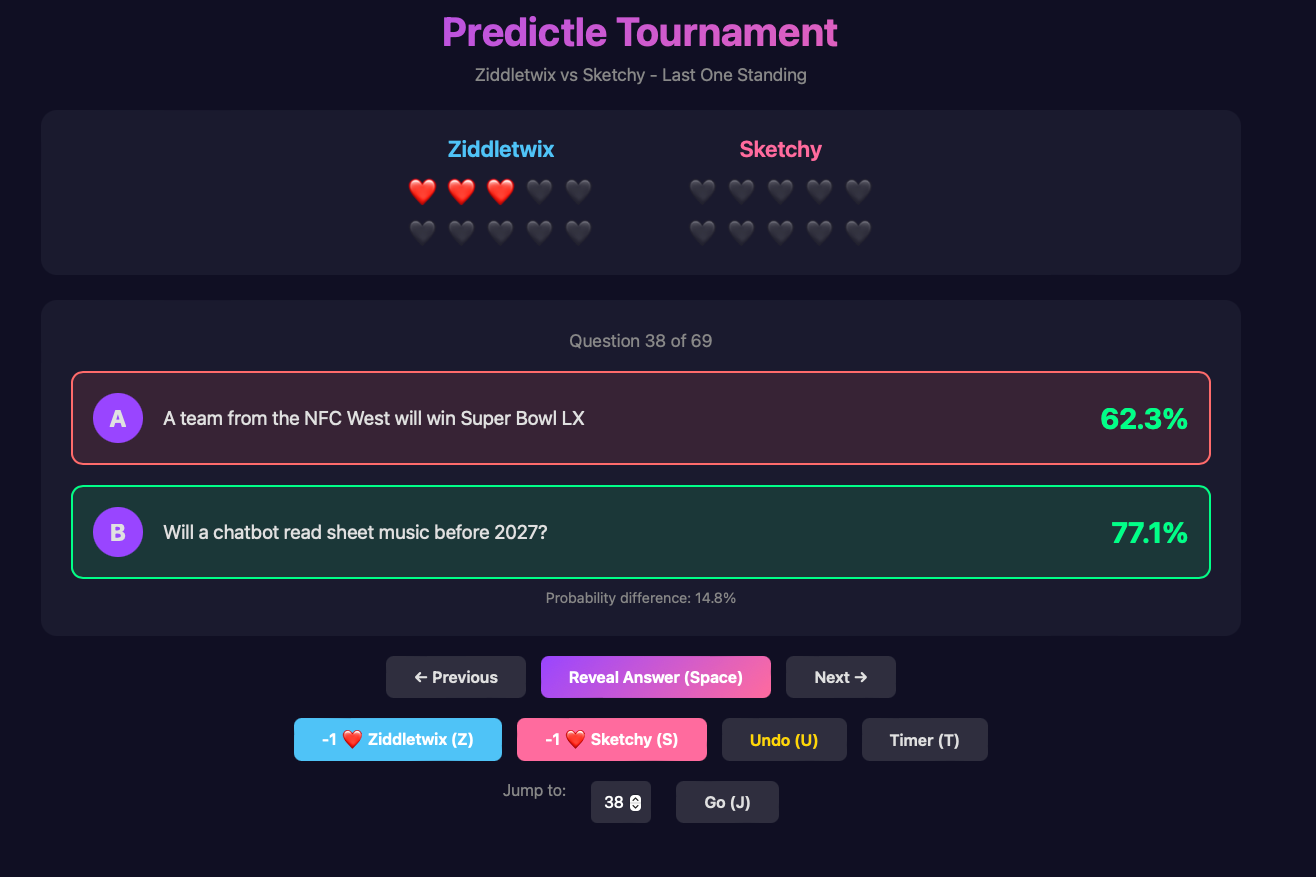 New Predictles drop every day at midnight, and Manifold has already crowned its first Predictle champion. After a week-long competition among dozens of Manifold users resulted in a tie between acclaimed Oscars trader, Ziddletwix, and the creator of the hottest bot on Manifold, Sketchy.