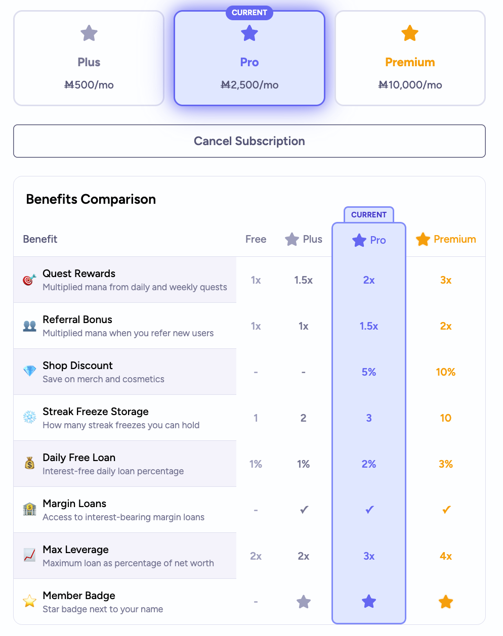 Perhaps most intriguing is the new Manifold subscription service, available for purchase in the shop. Subscriptions are purchasable through mana, not USD, and many are arguing that the Plus subscription should pay for itself through quest reward bonuses alone. I started off with the modest Pro membership, but I might save up to get a Premium when I have a trading week worthy of self-reward.