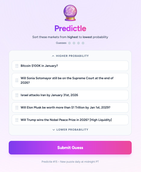 The latest hit -le game just dropped. Unlike spelling five-letter words (boring, static, generally unrelated to geopolitics), Predictle asks you to order five markets by probability. Here’s Predictle #15: