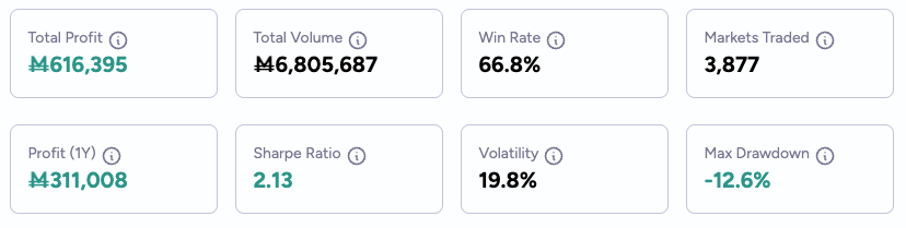 The new user calibration interface brings prediction market calibration into the modern era. While Brier scores have always been an odd fit with prediction markets, the new analytics include a Sharpe ratio, your max drawdown in the last 12 months, and a volatility score.