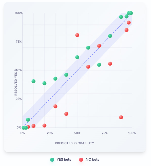 You can also track your calibration as a function of probability buckets. For example, this trader made a bajillion Mana betting that Biden would not be the 2024 nominee. See if you can identify the dot corresponding to that clever trade.
