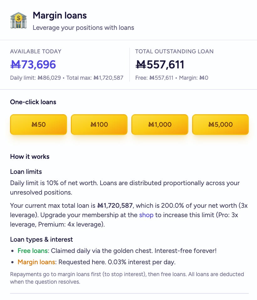 Amidst all these changes, the Manifold team is working hard to ensure that the interest + loans system of the site can best incentivize long-term predictions. While users can still collect daily zero-interest loans as before, there is now the option for margin loans, as well as the early repayment of old loans.