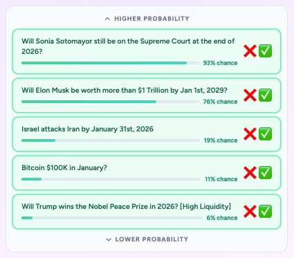Bitcoin generally goes up and likes round numbers (let’s say 75%) odds, Sotomayor will probably resign this year to let Trump appoint an adequate replacement (66%), Israel is famously rivals with Iran and will always look for a chance to go on the offensive (90%), Elon Musk, what is he, the Paypal guy, no chance he’s a trillionaire (3%), and didn’t Trump just make some sort of Board of Peace (50%)?