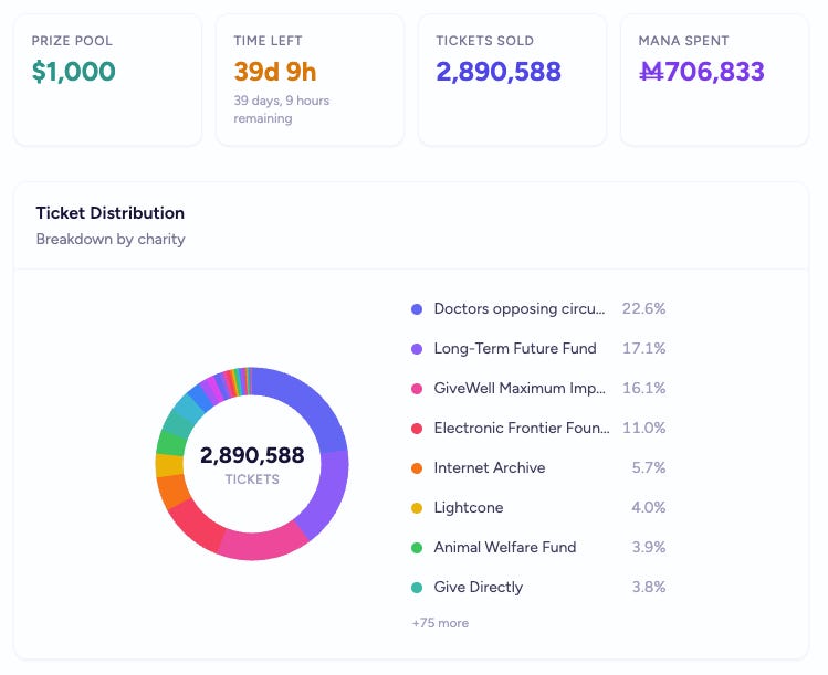 Manifold is currently running a charity giveaway, ending March 1st. Users can buy tickets to support the charities of their choice, and a lucky ticket will be drawn on that date to determine the winning charity. Currently, a little-known organization called Doctors Opposing Circumcision appears to be the leading candidate at 23%. If you support one of its competitors, like GiveWell, the Internet Archive, or Lightcone, you might want to chip in; may the odds be ever in your favor!