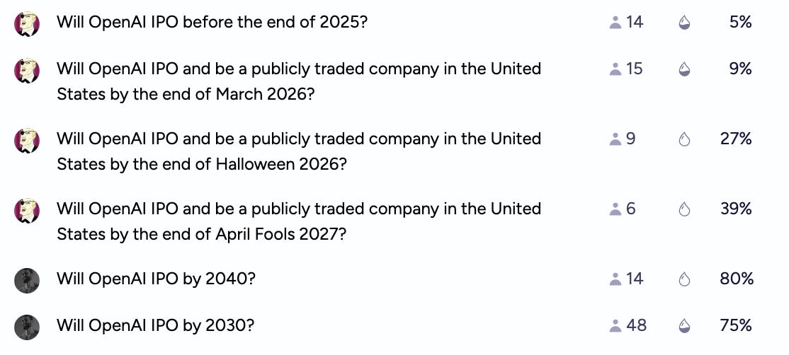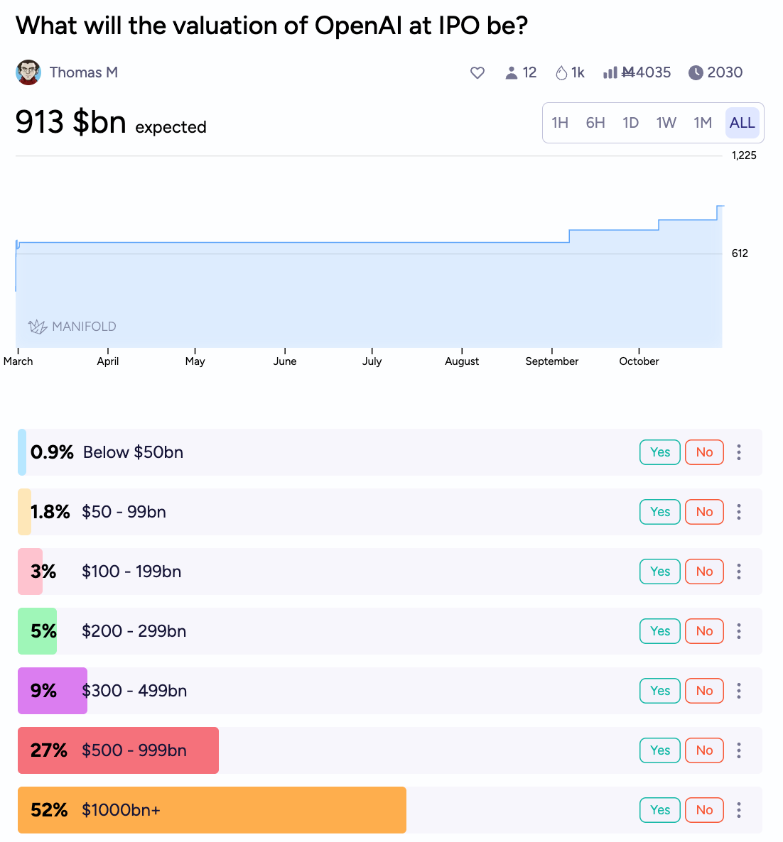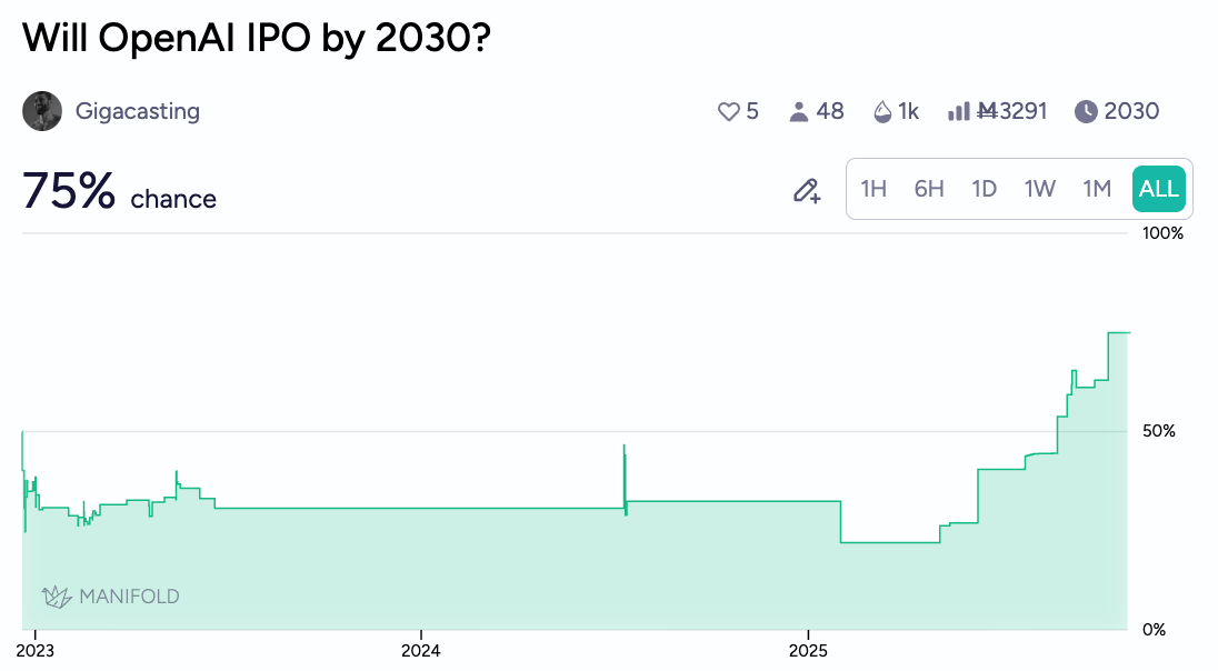 Forecasters also think the valuation of OpenAI will continue to increase before its IPO (which traders now think is 75% likely to happen in the next 4 years).