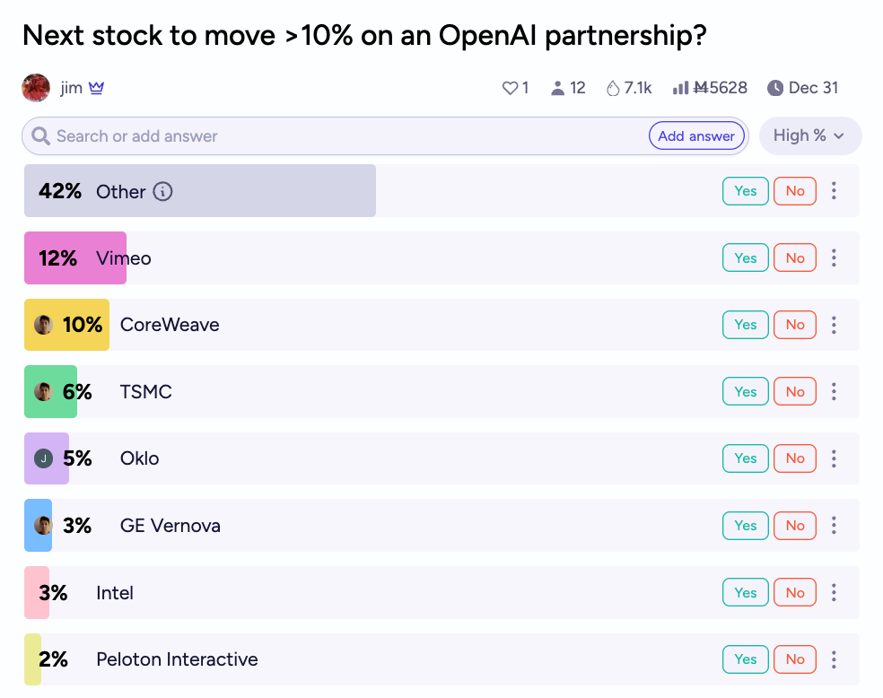 And these gaudy valuations are likely to involve further partnerships, mergers, and consolidations. You can speculate on what will be the next stock to soar upon news of a partnership with OpenAI (as Oracle and others have). The current leaders appear to be Vimeo, CoreWeave, and TSMC, but the market thinks there’s still a 2% chance that we get a live-generated Peloton instructor to cheer you on while biking.