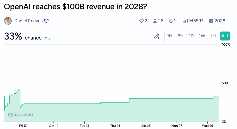 Will these valuations be justified? If OpenAI revenue continues to follow its upward trajectory, probably. Manifold gives pretty decent odds to OpenAI reaching $100 billion in revenue in just three years, and a ratio of about 5-10 between revenue and total valuation is fairly typical for tech companies (although their revenue is currently far lower). Peter Wildeford has a deep dive and some forecasts on why the valuation for OpenAI is not super unprecedented in the scale of fast-growing tech companies.
