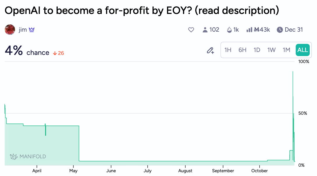 Despite the press framing, one Manifold market on whether OpenAI would become a for-profit corporation is unchanged. Why? Because Manifold’s core business is still “controlled by the non-profit board” pretty clearly under the terms of this arrangement, which was part of the criteria of this particular market. I think this operationalization is best. OpenAI has already been operating as a conventional corporation for some time, given that it creates, launches, and supports products that comprise billions of dollars of annual revenue. By restructuring as a PBC, has the company really divested control out of the hands of its NFP components? Not really, if you read the fine print.