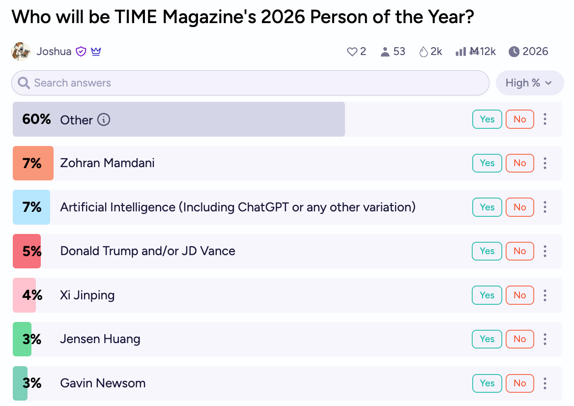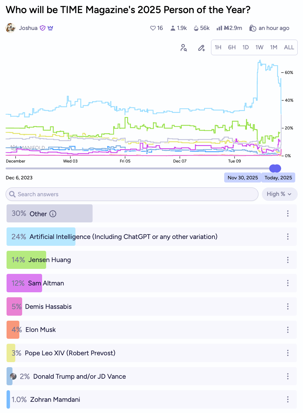 This year’s campaign had been reminiscent, with AI once again leading for most of the year, this time in its own right. Buzz around Jensen Huang started to bubble up in September, after traders perhaps started to price in a desire for TIME to laud a single individual, and Huang’s star had continued to rise amidst Nvidia’s lobbying campaign in Washington, and as discourse around data centers, GPUs, and corporate valuations has risen to a fever-pitch. Sam Altman also seemed to be a dark horse contender.