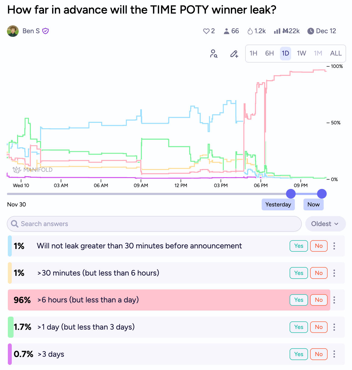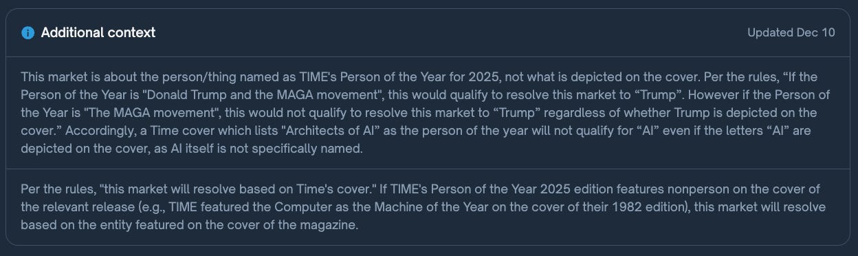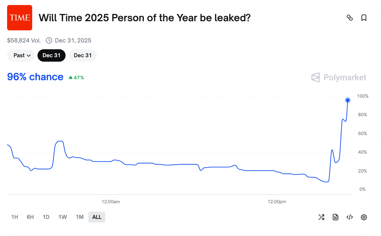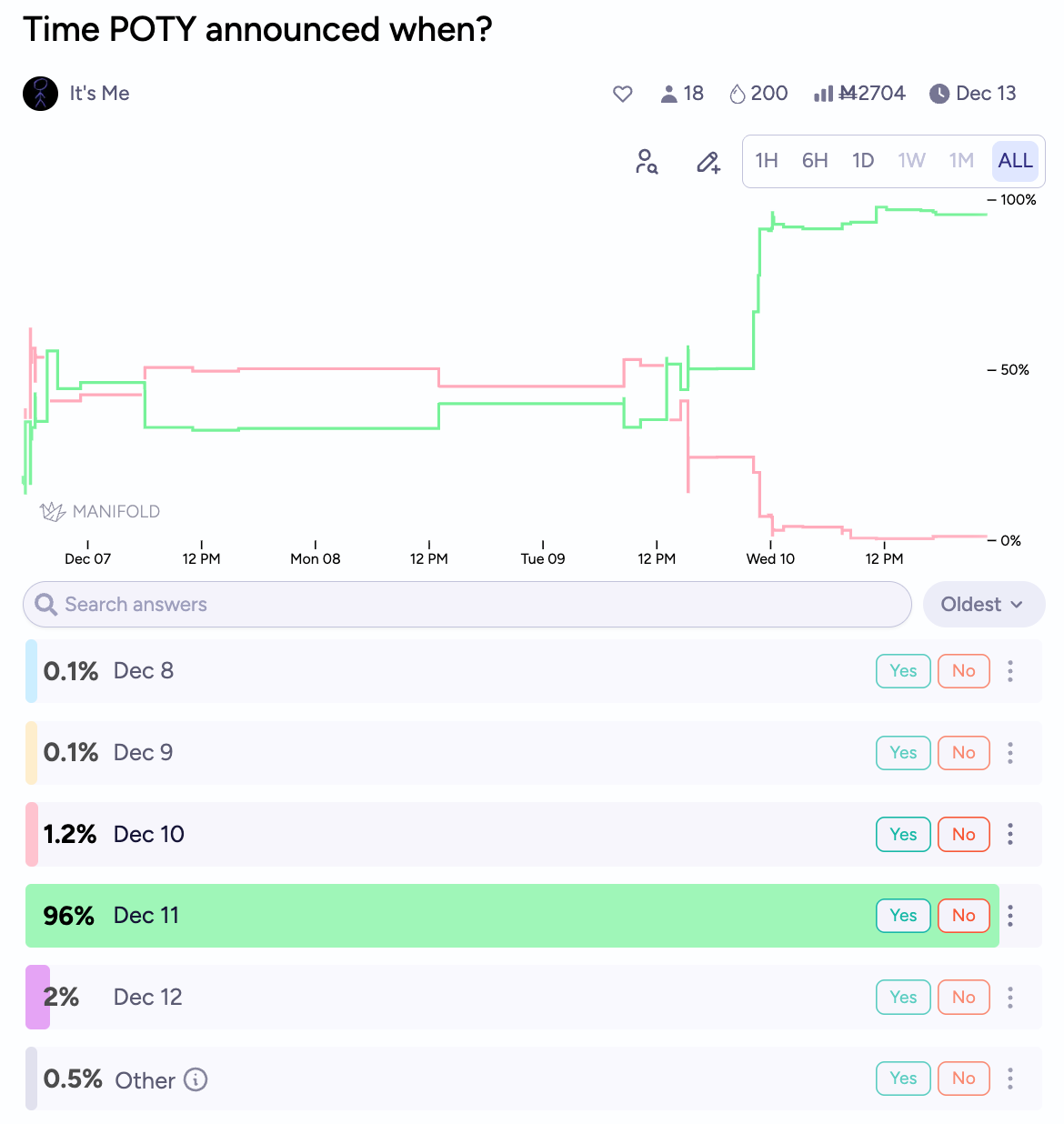 Around that same time, the market became quite confident that the POTY would be announced on December 11th, although this information was seemingly public and reported on. The reporting on subjects like these are starting to trust the prediction markets themselves though, which can create an interesting feedback loop.