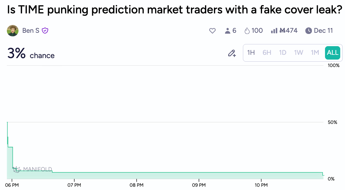 It would certainly be something if TIME had leaked a fake cover in order to mess with prediction markets, but traders do not think this is at all likely. On a Twitter space, one savvy prediction market trader mused that it wasn’t worth a few tens of thousands of dollars to lose your job at TIME over, but I think naming “Prediction Markets” the POTY after getting their traders to burn a few millions on a fake leak would be darkly humorous.